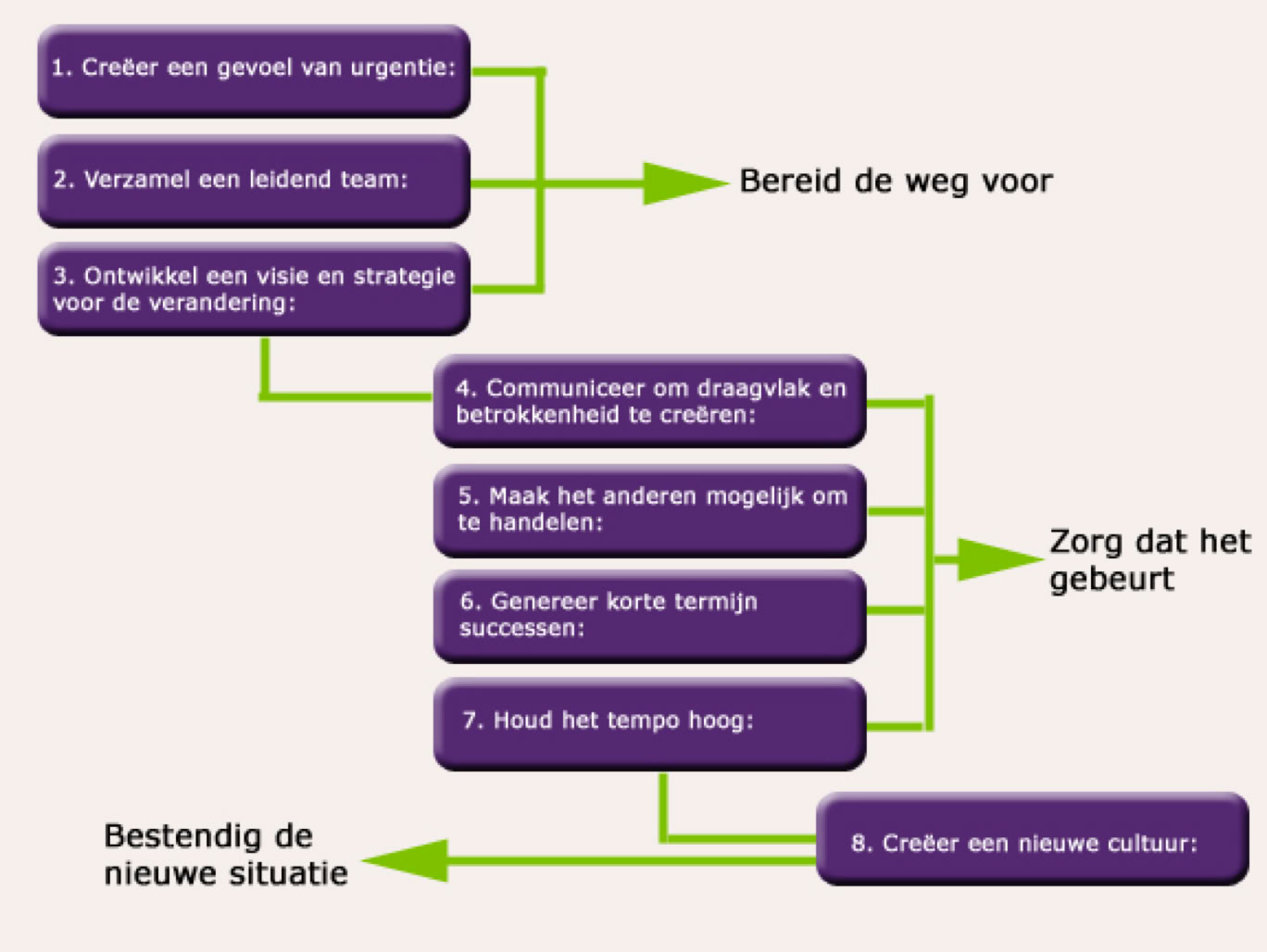 We schetsen nu acht succesfactoren die bijdragen aan het slagen van een verandering. Dit doen we aan de hand van het gezaghebbende werk Leiderschap bij verandering en The Heart of Change – Real Life Stories of How People Change Their Organizations van John P. Kotter en Dan S. Cohen.