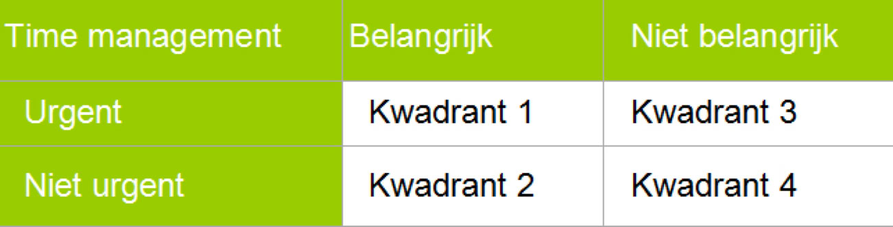 Er zijn veel theorieën over time management, echter wij richten ons op de meest praktische methode. We onderscheiden twee factoren die bepalen hoe wij onze tijd verdelen: Urgentie en Belangrijkheid. Daarmee ontstaat vanzelfsprekend ook: Niet urgent en Niet belangrijk.